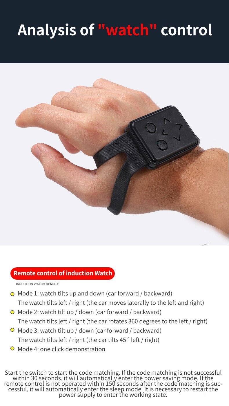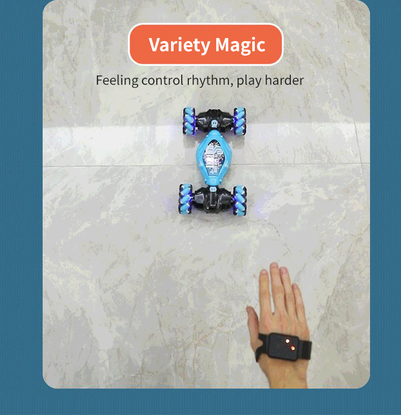 • Double Ways Control Modes: Our rc stunt car is upgraded with 2 control ways: gravity sensor watch control and remote controller. You just need to wear a gesture-sensing watch and give a gesture, and the remote control car will act accordingly. Or you can easy to control remote controller with 2.4ghz transmitter strength, that is sensitive and responsive, you can be maneuvered even from a far distance.(You can not control the car toy with two way at the same time.)